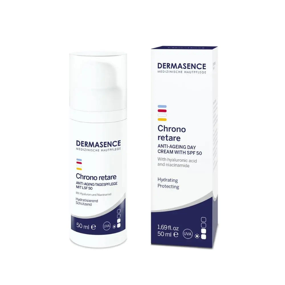 DERMASENCE Chrono Retare Anti Ageing Day Cream SPF50 geeft bescherming en comfort aan een vochtarme en vetarme huid. De crème is ontwikkeld voor gebruik tijdens de overgang en ondersteunt het verminderen van donkere vlekken.
