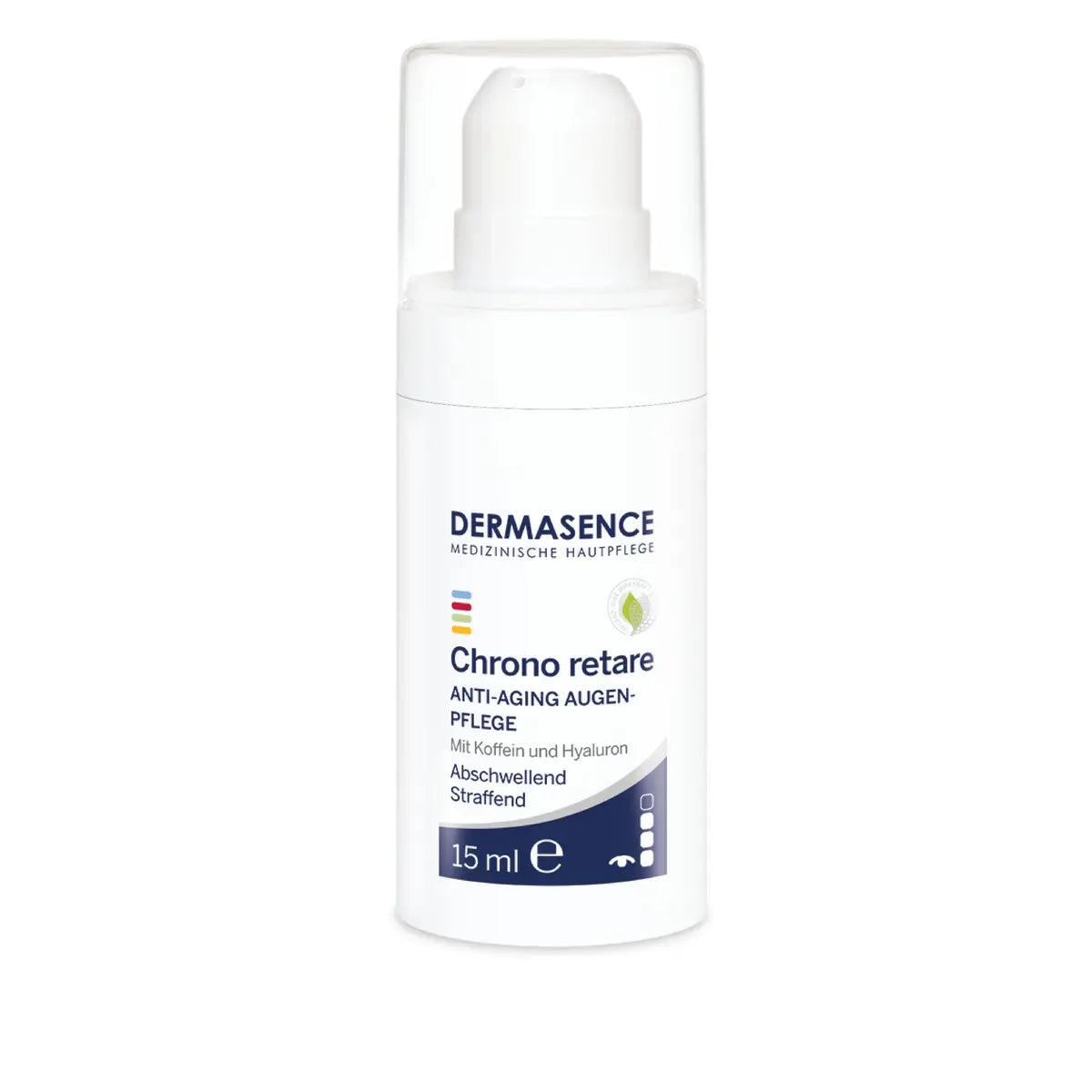 DERMASENCE Chrono Retare Anti Ageing Eye Care richt zich op donkere kringen, zwelling en fijne lijntjes rond de ogen. Cafeïne stimuleert de doorbloeding en helpt puffiness te verminderen terwijl hyaluronzuur direct hydrateert zodat droogtelijntjes minder zichtbaar worden.