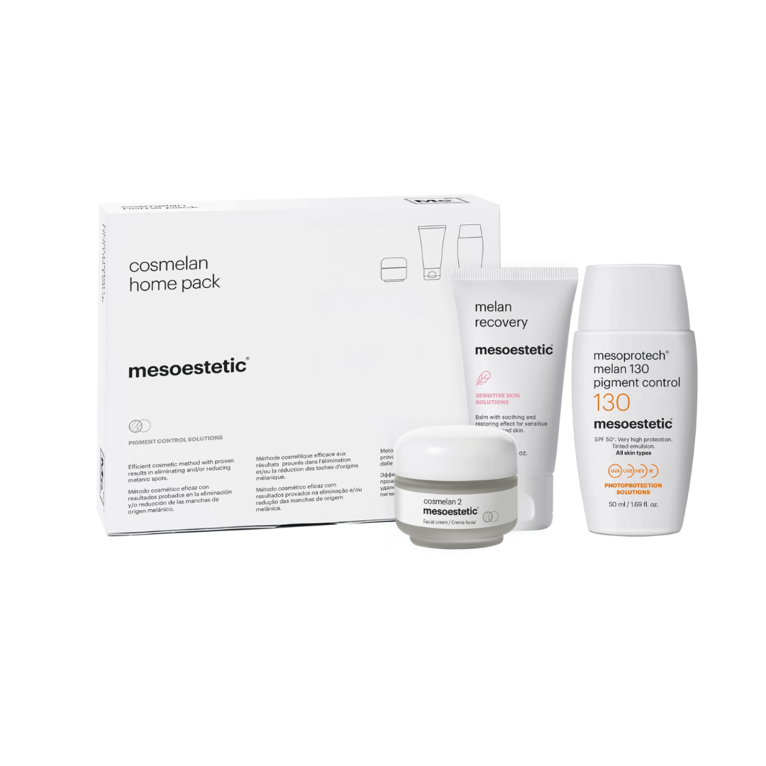 In dit Cosmelan® thuispakket zitten 3 essentiële producten om hardnekkige pigmentvlekken effectief te vervagen. Het pakket bestaat uit Cosmelan 2 crème, Melan Recovery en Melan 130+ Pigment Control.